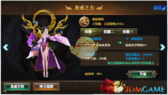 技能激活后,玩家更可升级三个子技能,进一步增强技能威力,释放出震撼的破坏力!
